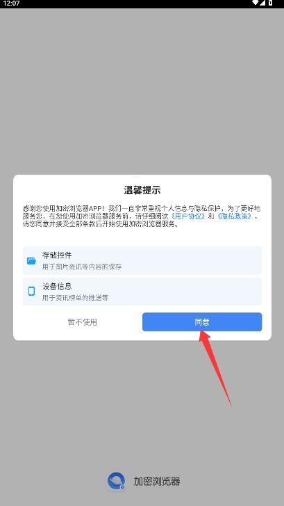 1、打开应用后仔细阅读用户协议和隐私政策,确认后点击同意按钮进入应用。