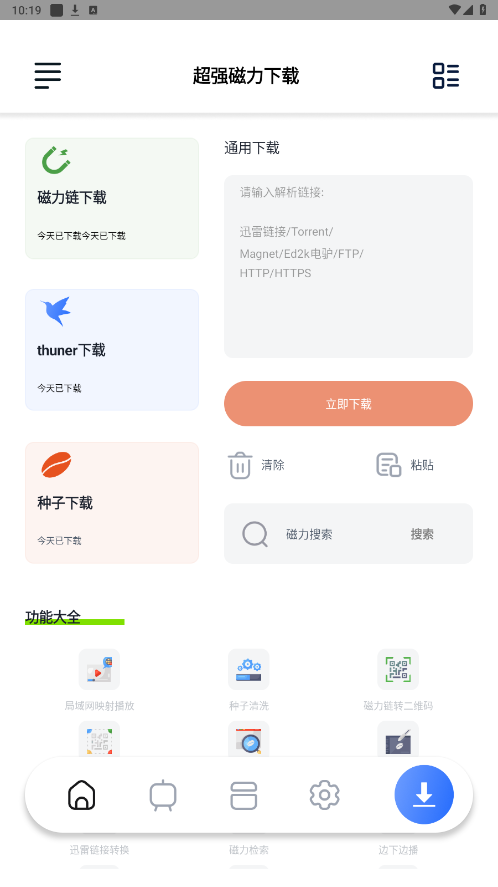 1、打开软件首页,可以看见有磁力下载、thuner下载、种子下载、http下载、FTP下载等等,还有磁力转二维码、本地种子扫描、种子清晰等工具。