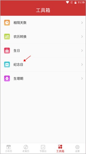 1、打开软件,进入“工具箱”模块,点击选择“纪念日”工具。