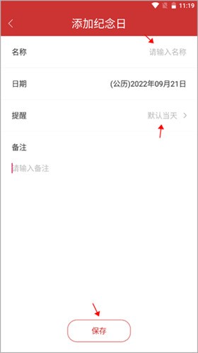 3、名称和提醒时间,确认后点击保存,即可在纪念日列表中查看记录。