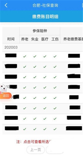 3、点击【缴费项目明细】,会显示相应的缴费账目明细,包括时间、参保险种、养老缴费基数