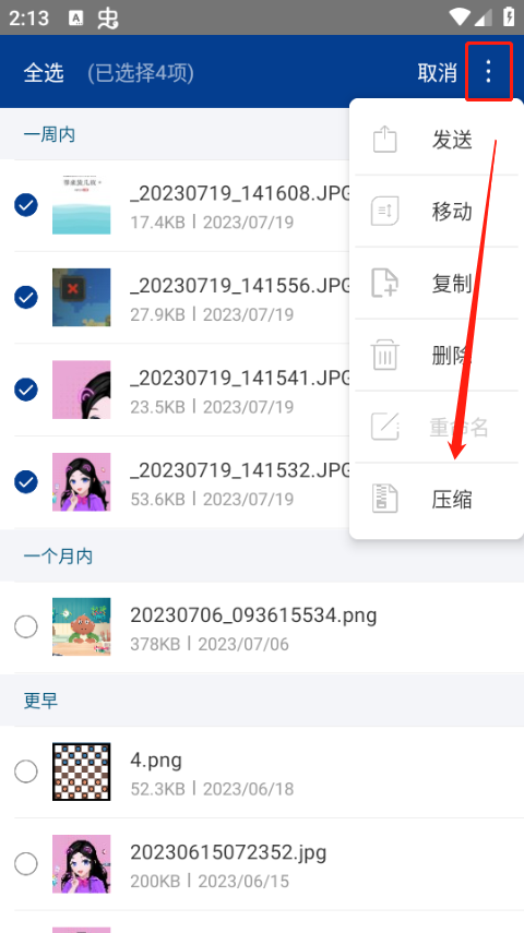 3、选择多张图片,点击右上角的三个点,选择压缩。