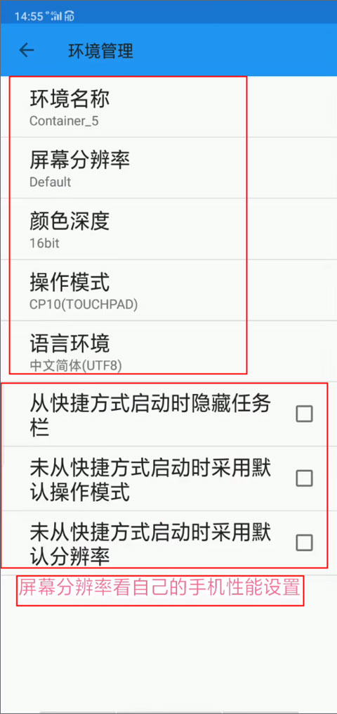 4、下面就是要设置一下参数,像屏幕分辨率、颜色深度、操作模式等,屏幕分辨率是看自己手机性能设置的。