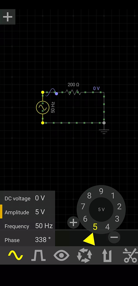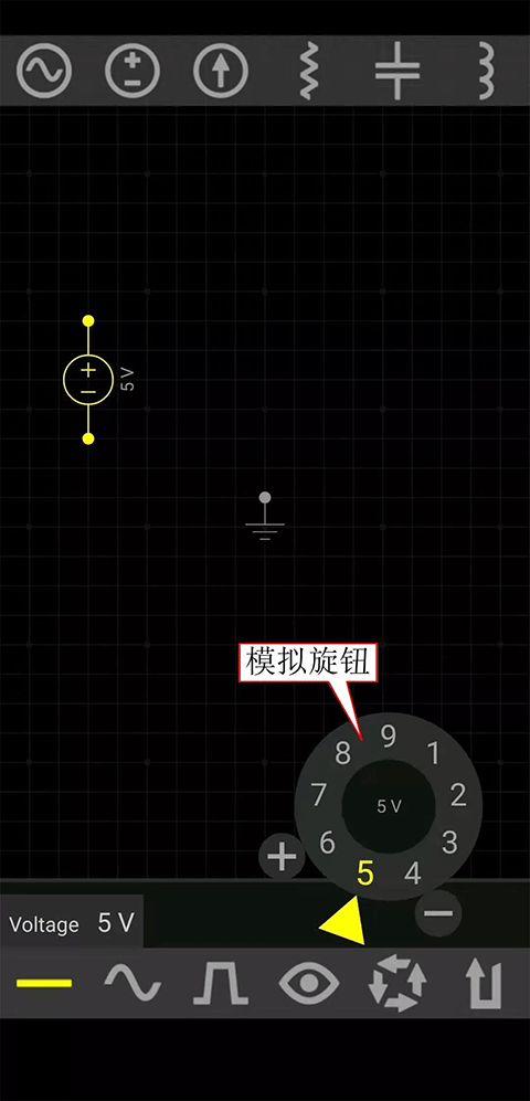 让稳压电源处在高光状态(黄色),点击扳手,弹出模拟旋钮,按住黄色三角形,旋转,将电源电压调为5V。