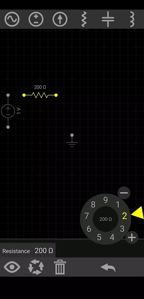点击组件列表中的电阻并拖到合适的位置,让电阻处在高光状态(黄色),点击旋转按钮,使电阻水平装置,并用模拟旋钮将电阻值调为200Ω。