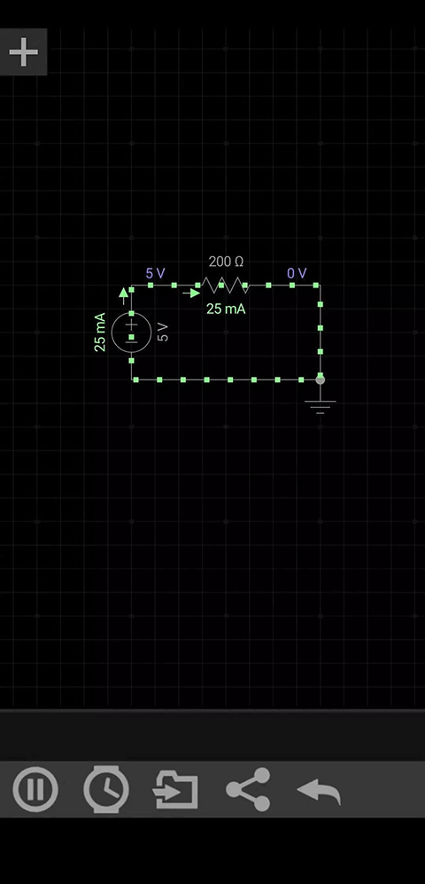 第四步:点击运行按钮(带t的黄色三角形),模拟电路的工作过程。移动的链接点表示电流,根据欧姆定律,电源电压5V,电阻200Ω,计算得到电流为25mA,与软件模拟的结果一样。