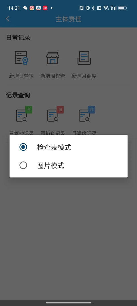 点击“新增日管控”按钮,弹出新增页面,有检查表模式和图片模式可供选择,任一模式均可,其中图片模式要求上传纸质版“日管控”表照片: