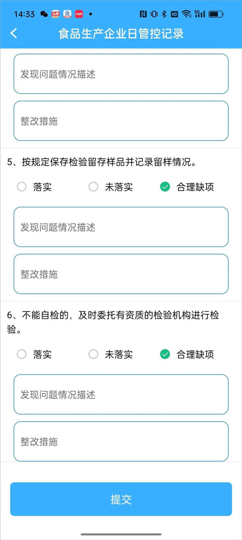 填写时,食品安全员:填写企业食品安全员姓名。检查场所:填写食品生产经营场所。检查时间为当日,对自查内容依次如实选择“落实”或“未落实”,与本企业无关的,点选“合理缺项”,完成后点击“提交”: