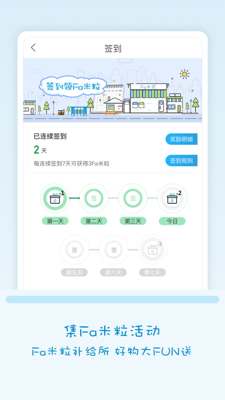 集Fa米粒:新人注册、签到、限时活动及线下消费皆可获得Fa米粒,Fa米粒可在app内兑换超值商品券,在线下门店出示优惠券即可进行使用(特殊门店除外)