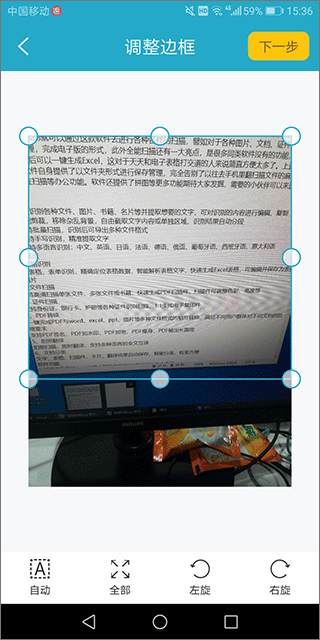 3、拍照完成后,可以手动矩形框对照片中的文字进行区域选择,选择好后点击右上角“下一少”确认