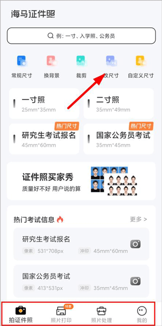 1、打开海马证件照app,有拍证件照、照片打印、照片处理和我的版块;