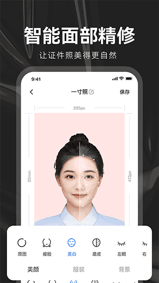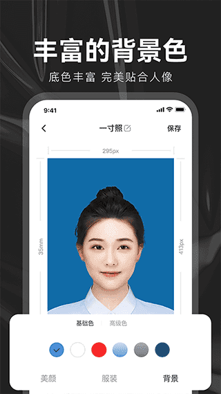 3、随意的去修改背景,也可以让自己的皮肤变得更好,也能够选择不同的证件照尺寸。
