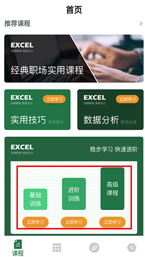 2、在课程这里,有实用技巧、数据分析等,还有初级、中级、高级等视频教程进阶;