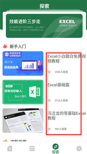 4、点开探索,有各种针对于新手的视频教程,还有各种提升excel表格制作能力的进阶教程;