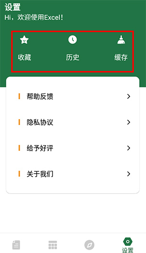 5、点开设置,可以查看我的收藏、历史、缓存等,还可以将使用过程中遇到的问题反馈给制作方。