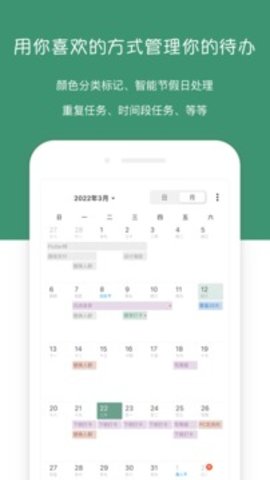 想要更清楚地看到你每天的工作,你需要使用日历视图,在主界面点击“日历”即可,你可以按月或按天查看你的任务。任务支持颜色分类标记.时间段任务。