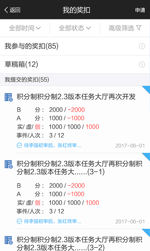 ◆显示个人当月提交已审核通过的实产值、虚产值、创富产值的奖扣事件列表。