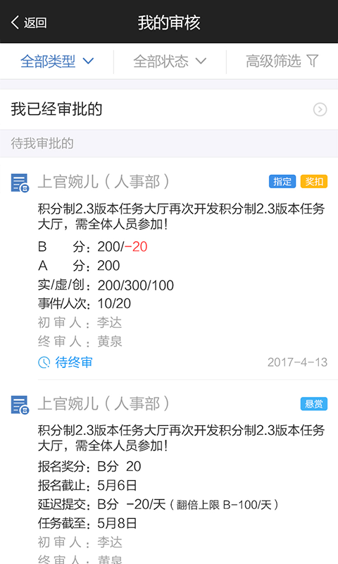 【积分管理】:游戏式管理,自定义奖扣事件标准,全方位数据量化考核