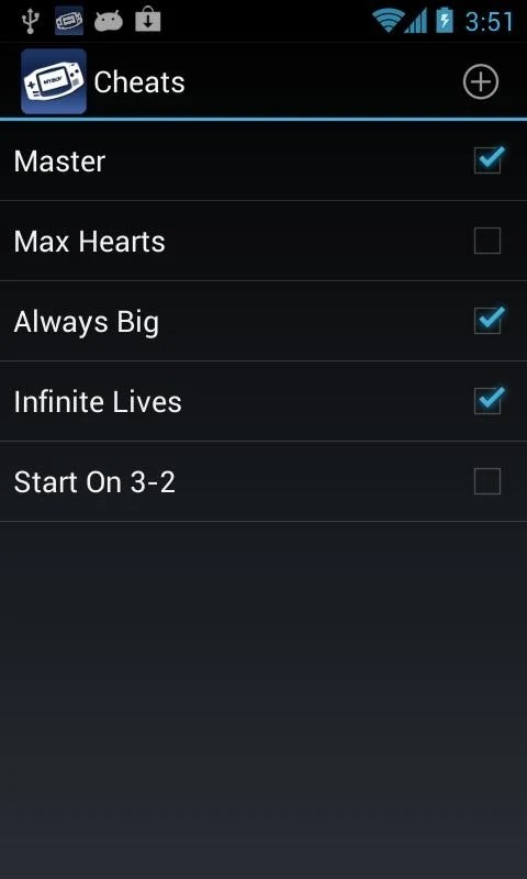 1、在手机上打开gba模拟器安卓版,运行游戏后,点击如下图标,选择Cheats
