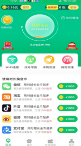 ·金币功能,自由提现,用户通过使用软件来连接WiFi时,使用软件的时长会在后台记录,达成软件任务可以让金币提现。