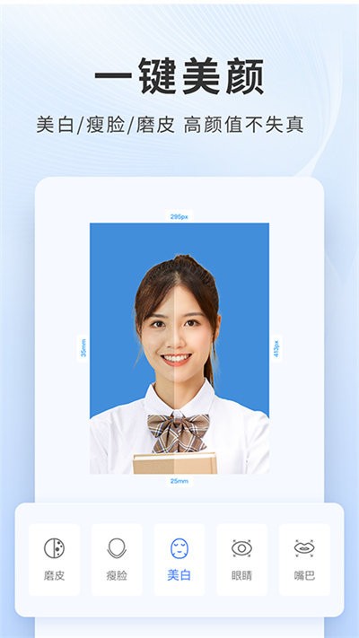 2、在证件照换衣服这款软件里面您还可以矫正面部形象,美化它,消除面部瑕疵,赋予良好的状态,创造人类最美丽的形象。