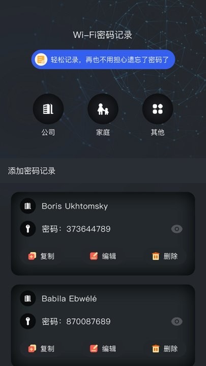 1、线上专门为大家提供的wifi密码记录功能,可以在这里随心体验!