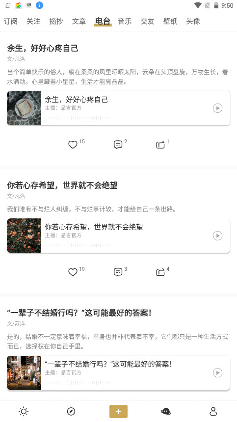 本款软件为用户收录了大量类型的文案素材,经典的影视台词、富有这里的歌词、心灵鸡汤、人生启迪等,从能够找到符合自己当时心境的句子,从而让你发表到自己的朋友圈来抒发自己的心情,你有什么好的句子,在里面也是能够分享的,音乐、电台还是文章都可以分享,让更多的人收藏自己所喜欢的文案。
