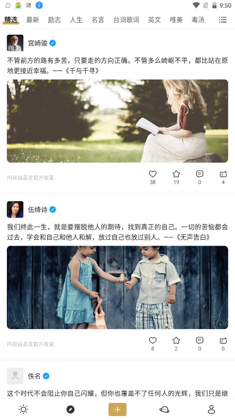品言文案app是款精选文案素材,在拍摄视频或者是发表朋友圈的时候,你可以通过这个软件来找到合适自己心情的文案,支持用户复制粘贴以及分享的,有你所感兴趣的文案还能够收藏评论,玩法相当的多样化,拥有语录集,励志、唯美、毒汤、台词歌词等经典语录,让你更好的诠释自己的心中想法。