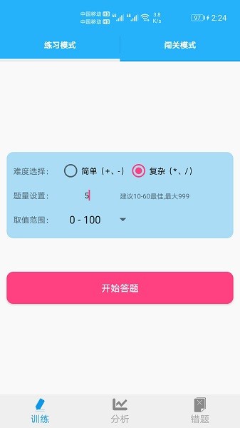 帮助孩子数学口算练习,加减乘除多种练习题目,定制口算题目,自由设置题目难度、题目数量和取值范围,包含练习模式和闯关模式,正确率分析和错题解析,观察进步程度。