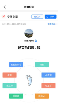 根据测量结果,量脚码APP可以生成普通测量报告和专属测量报告,给出穿鞋建议,并可保存和分享。