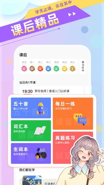 日语GO从零基础入门到高阶,让你零基础轻松学日语。课后真人云辅导,日中翻译,单词实练,趣味学习。一款好用的日语入门学习工具,对日语初学者很友好。