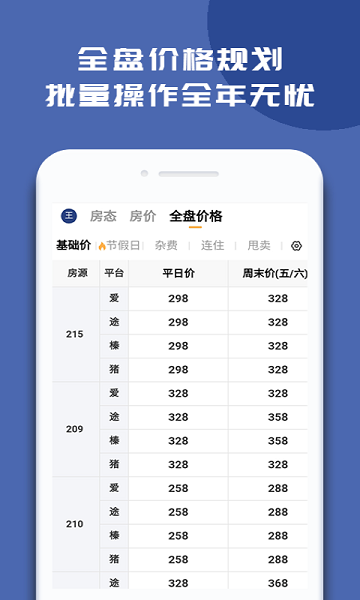 3.可以设置全网同价并一键改价,由房东决定基础价(平日价)和周末价,就可以实时同步所有平台价格