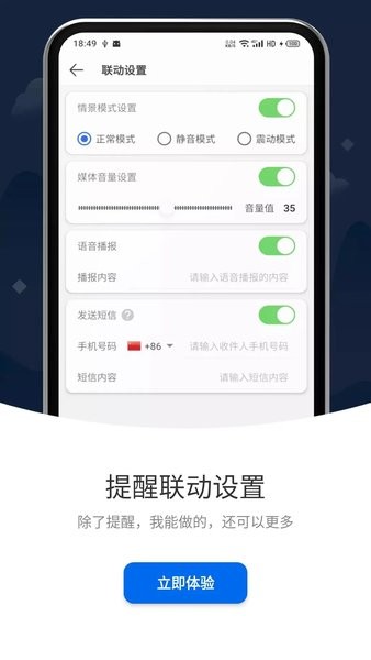 【联动操作】当已设置的提醒事件被触发时,既可自动设置手机的情景模式(如静音,震动),又可自动设置手机的媒体音量,避免一些大型社死发生,做你贴心的生活助手!