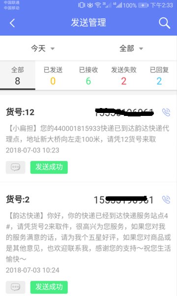 快递员小扁担app可支持手机号码后四位、日期或发送状态查询,及时了解短信状态。