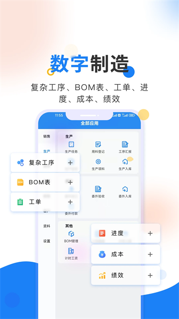 2、生产管理:生产工艺/工序、生产计划、生产单、委外加工、成本核算;