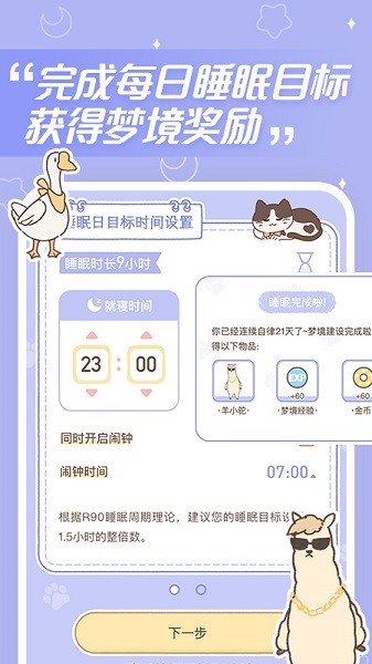 1.努力达成你设置的睡眠时间目标,获得梦境奖励,在梦境中经营自己的旅店,收集多种家具装饰和动物