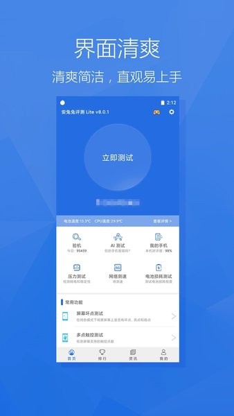 安兔兔评测Lite版为安兔兔评测的轻量版本,降低了跑分门槛,低配手机也可顺利进行测试流程。