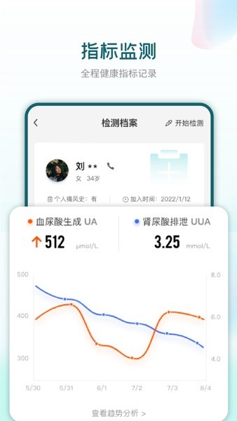 针对痛风数字化健康管理的平台应用。搭配乐尔健康自主研发的智能物联网检测设备--「知痛风」智能分型仪,可实现健康指标的全程数据化管理。「知痛风」采用先进的血、尿双样本检测技术,配合智能算法为用户提供“辅助分型”、“痛风预测”、“代谢指标”等具有临床参考价值的指标,在高尿酸血症及痛风的康复管理上已经取得了显著的成效。