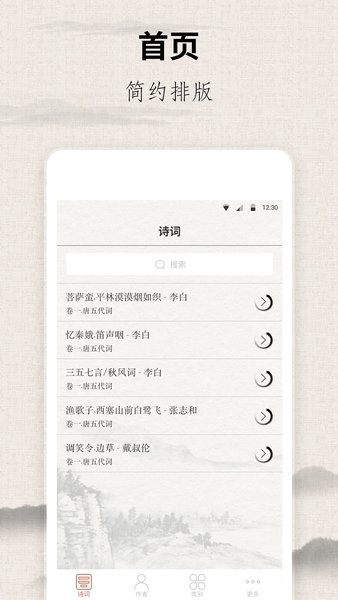 宋词三百首app安卓版内置宋词三百首,支持通过作者或者类别来进行筛选,软件绿色无广告,界面看起非常的简洁,有需要的网友可以下载体验!