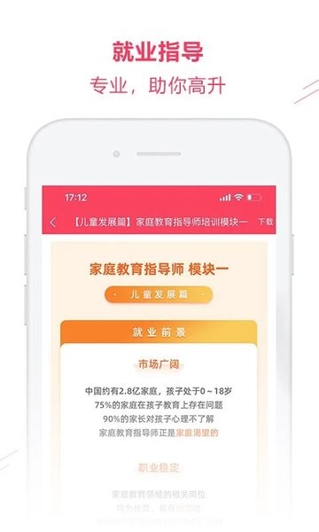 提供专业家庭职业教育培训的便捷学习工具。旨在为用户打造快捷高效的在线学习平台。在线聚合了优质丰富教学资源,为用户量身制定专业学习计划,来自名校专业的教师团队,引导式教学,让您拥有高质量教学,轻松高效学习成长。通过平台可以掌握0-18岁儿童成长规律,系统的学习教育学和心理学知识,让您拥有正确家庭教育指导能力,掌握科学培养孩子良好习惯的方法,突破时间和空间的限制,合理利用碎片时间,学习专业家庭教育,快速成为家庭教育指导师。