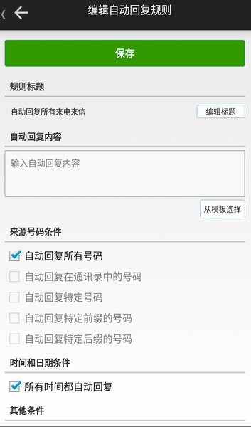 每个自动回复规则都支持多种条件(时间范围、日期范围、星期范围),还有其他条件例如(充电、震动等)