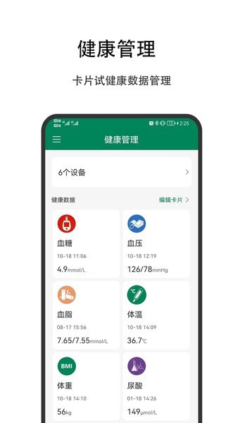支持血糖、尿酸、血脂、血压、尿液、体重、温度等数据手动录入,分析整理数据日志,数据变化趋势,轻松掌握健康数据变化趋势。