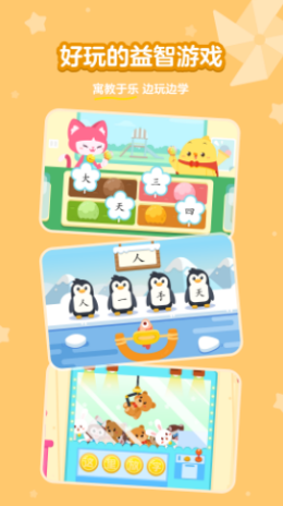 ·益智游戏,潜移默化,软件中设计了独特的益智游戏模式,可以让孩子在游玩的过程中来进行汉字的理解和认识,提高汉字的使用技巧。