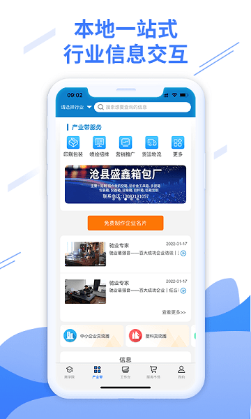 为河北驰业网络科技有限公司推出的一款本地化一站式行业信息交互平台,为商家建立全方位的市场营销解决方案,本APP为中小型企业用户提供各行业在线学习课程、随时随地的进行移动碎片化学习深造;上百名资深行业行家在线为用户解答咨询,提供专属客服经理一对一服务,同时也提供一站式互联网营销解决方案,帮助中小型企业快速成长。
