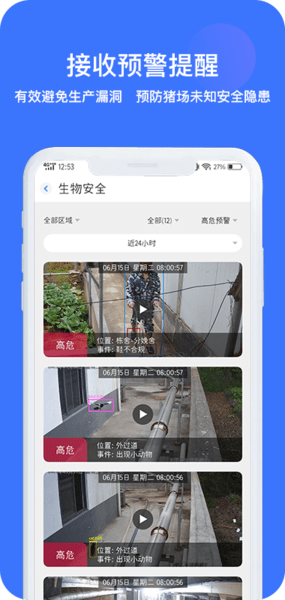 接收预警提醒,查看危险事件的监控视频,预防猪场未知安全隐患;