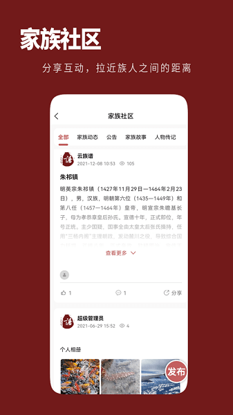 1、活跃的家族社区,族人可在此发布家族动态,更有精美模板供您选择