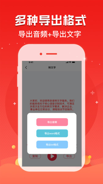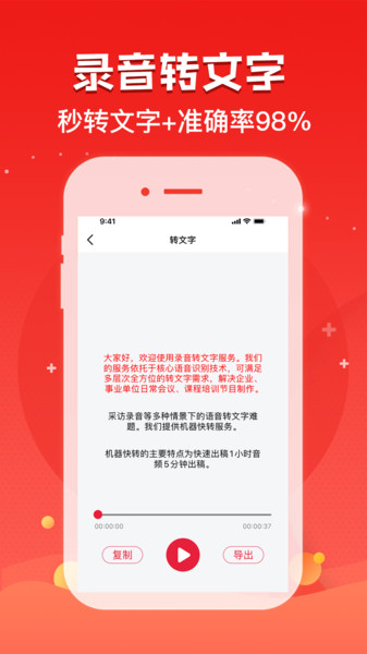 支持录音转文字、音频转文字、语音转文字、听写、语音识别、音频提取器、语音输出、语音导出。