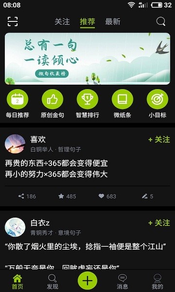 2.系统每日推送推荐与最新句子,可以查看关注对象动态