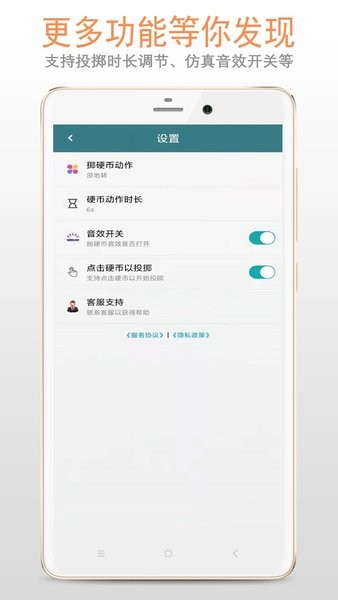 2、支持抛投时间,以及音效的设置,最大程度还原真实抛硬币的体验。