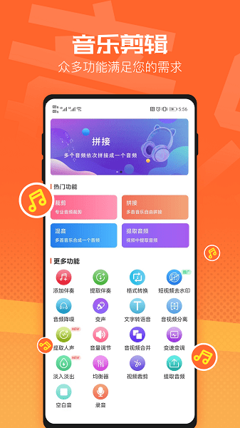 音乐剪辑软件,支持音频裁剪、混音、拼接、添加伴奏、提取人声、淡入淡出、文字转语音、短视频去水印、音频格式转换、视频提取音频、变声、变速变调、提取伴奏、音频降噪、添加均衡器、音量调节、音视频合成、音视频分离、生成空白音。众多功能满足您的需求,赶快下载体验吧!